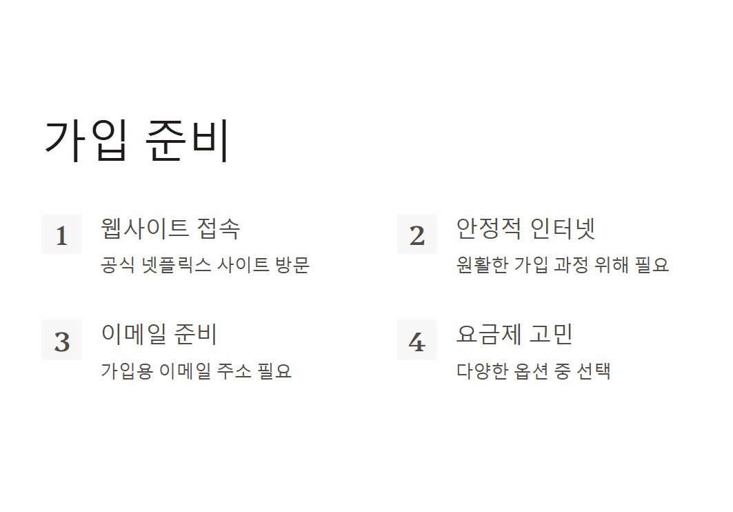 넷플릭스 가입을 시작하기 전에 몇 가지 준비가 필요합니다. 먼저, 안정적인 인터넷 연결이 필수적입니다. 또한, 가입에 사용할 이메일 주소와 비밀번호를 미리 정해두는 것이 좋습니다. 넷플릭스는 다양한 요금제를 제공하므로, 어떤 요금제를 선택할지 미리 고려해두면 가입 과정을 더욱 빠르게 진행할 수 있습니다. 준비가 완료되었다면, 웹 브라우저를 열고 넷플릭스 공식 웹사이트(www.netflix.com)에 접속합니다. 홈페이지에서 '가입하기' 또는 '시작하기' 버튼을 클릭하여 가입 절차를 시작합니다.