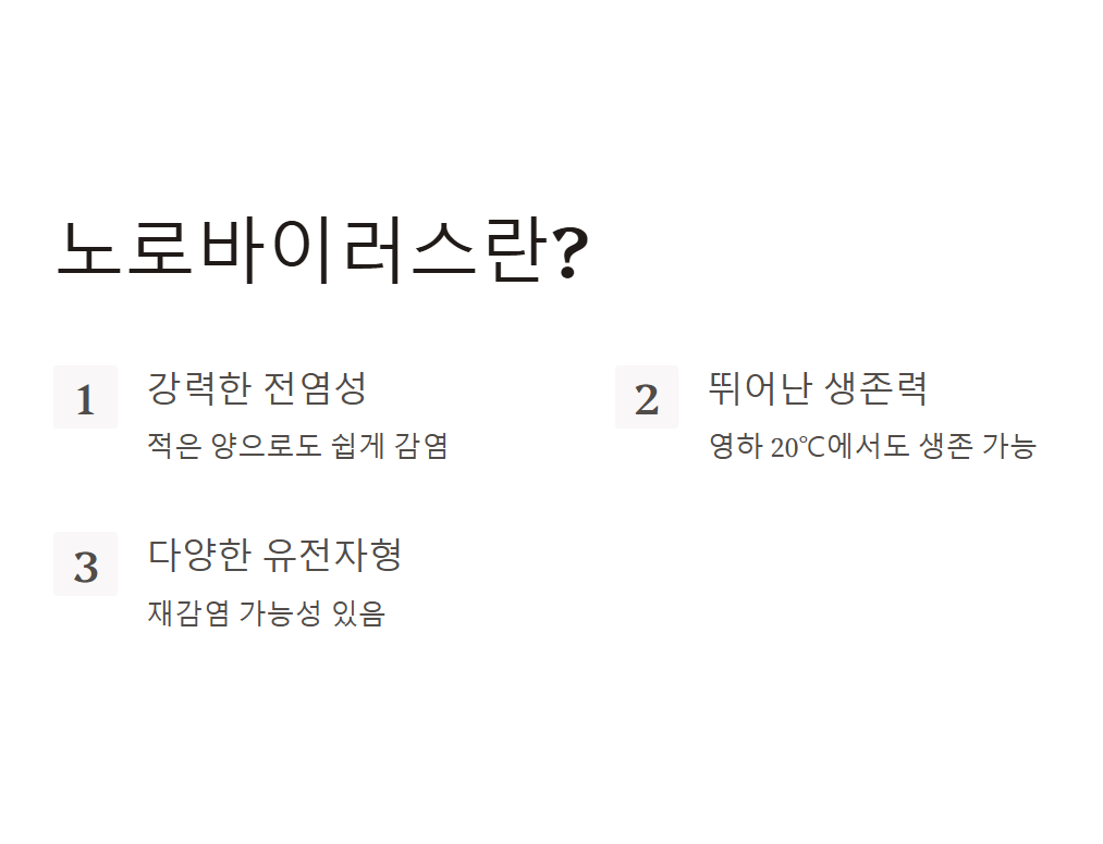 • 강력한 전염성: 적은 양의 바이러스로도 쉽게 감염될 수 있으며, 감염자의 구토물이나 분변을 통해 쉽게 전파됩니다.