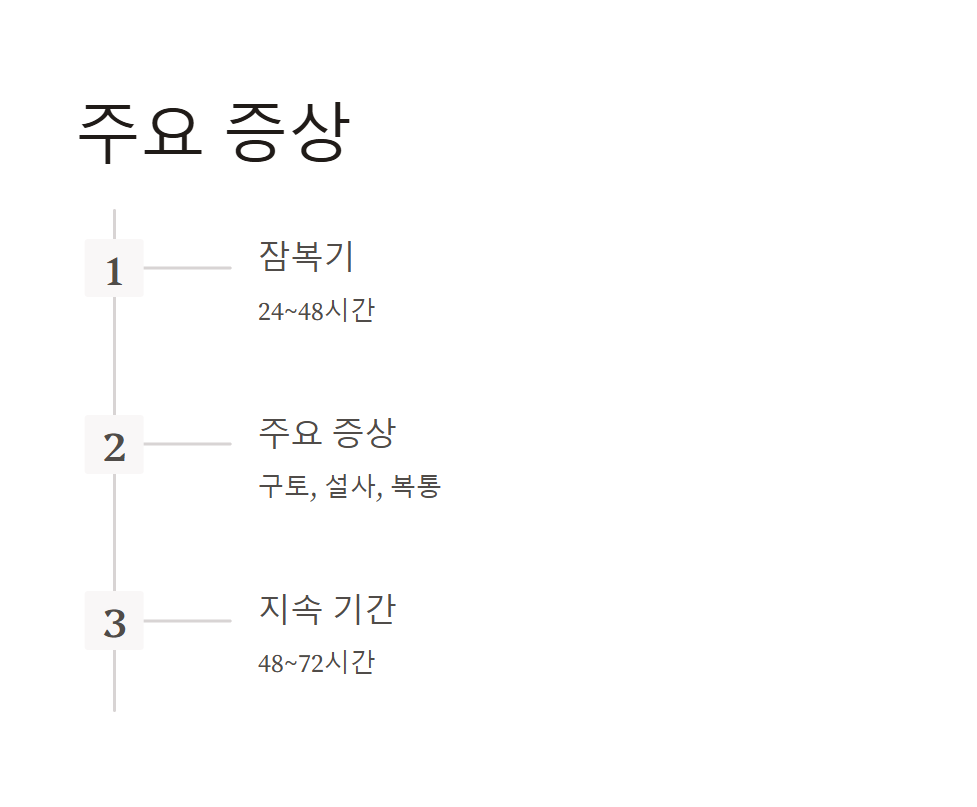• 증상 발현 시기: 감염 후 24~48시간의 잠복기를 거쳐 증상이 나타나며, 보통 48~72시간 동안 지속되다 자연스럽게 회복됩니다.