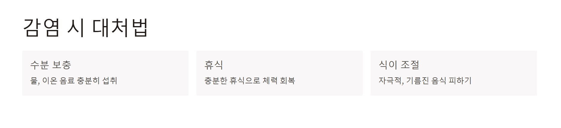• 의료기관 방문: 증상이 심하거나 지속될 경우, 또는 탈수 증상이 심하게 나타나는 경우 즉시 의료기관을 방문하여 진료를 받아야 합니다.