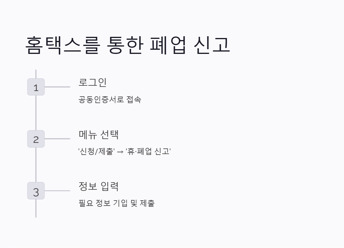 폐업 신고는 여러 방법으로 진행할 수 있습니다. 가장 일반적인 방법은 홈택스를 이용하는 것입니다. 홈택스에 접속하여 공동인증서로 로그인한 후, '신청/제출' 메뉴에서 '휴·폐업 신고'를 선택하면 됩니다. 이후 안내에 따라 필요한 정보를 입력하고 제출하면 폐업 신고가 완료됩니다.