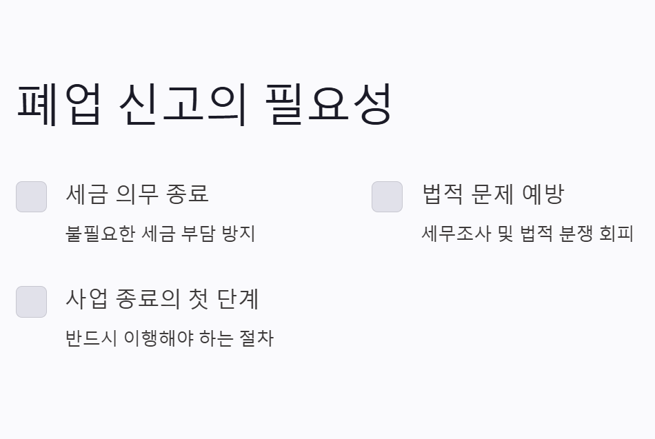 셋째, 폐업 신고를 하지 않으면 건강보험공단과 국민연금에도 반영되지 않아 보험료가 적절하게 재산정되지 않을 수 있습니다. 따라서 폐업 신고는 단순히 세무적인 측면뿐만 아니라, 개인의 사회보험에도 영향을 미친다는 점을 유념해야 합니다.