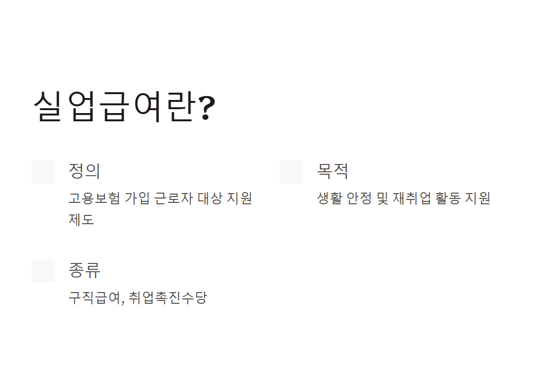 - 구직급여: 일반적인 실업급여로, 실직 기간 동안 지급되는 급여입니다. 이 가이드에서는 주로 구직급여에 대해 다룹니다.
