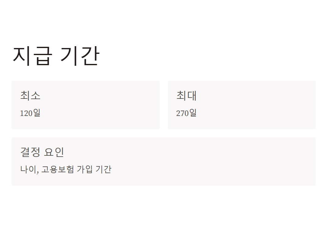 - 소정 급여일수: 최소 120일에서 최대 270일까지 (나이 및 고용보험 가입 기간에 따라 상이)