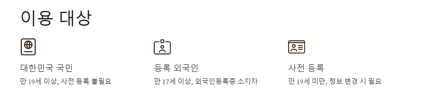 - 등록 외국인: 외국인등록증 또는 거소신고증을 발급받은 만 17세 이상의 등록 외국인(난민 제외)도 이용 가능합니다.