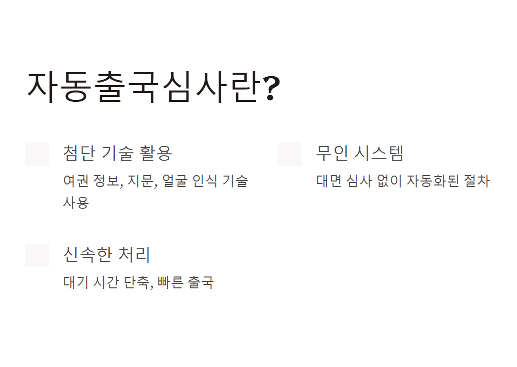 - 무인 심사 시스템: 출국 심사관과의 대면 심사 없이 기계를 통해 스스로 출국 심사를 진행하는 방식입니다.