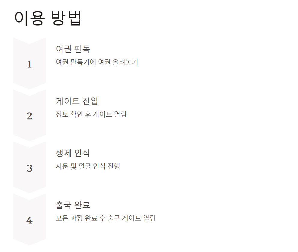 - 편리한 이용: 여권 판독과 생체 인식만으로 간편하게 출국 심사를 완료할 수 있습니다.