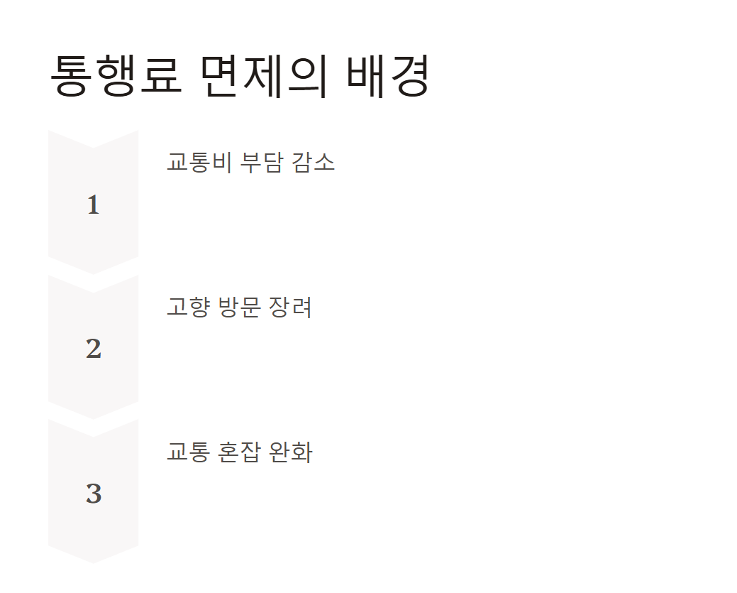 정부는 매년 명절 기간 동안 고속도로 통행료를 면제하는 정책을 시행해 왔습니다. 이는 귀성객들의 교통비 부담을 줄이고, 고향 방문을 장려하기 위한 목적입니다. 특히, 설날과 추석 같은 주요 명절에는 많은 사람들이 고향을 방문하기 때문에, 이러한 정책은 교통 혼잡을 완화하는 데에도 기여하고 있습니다.